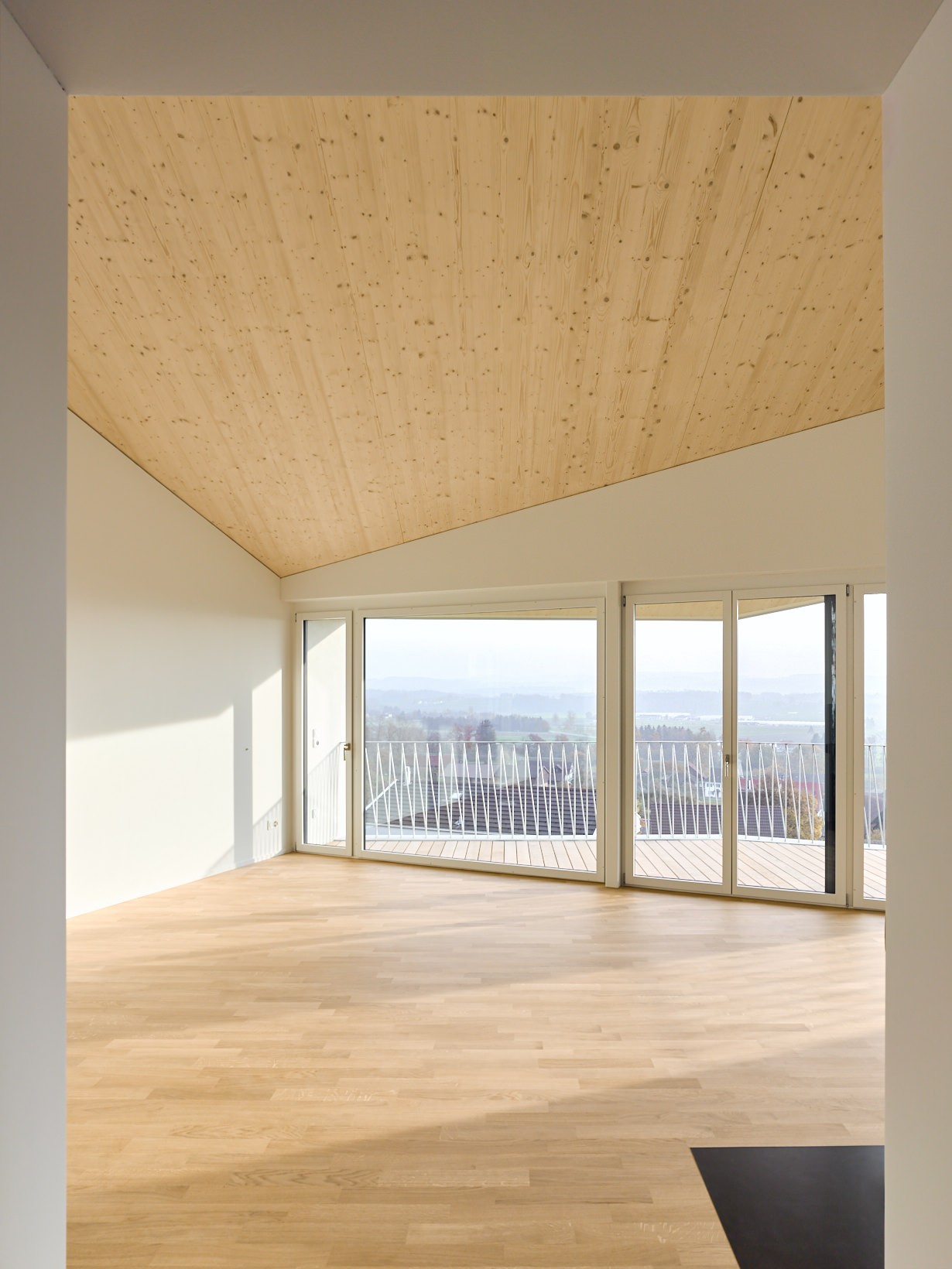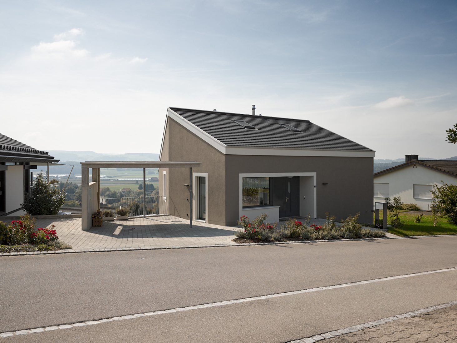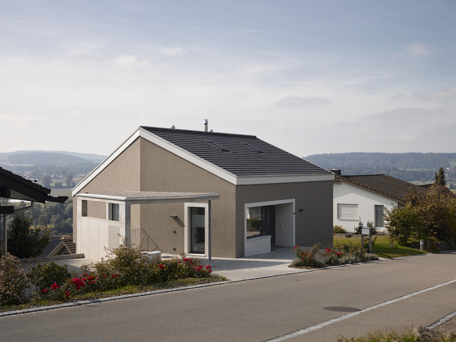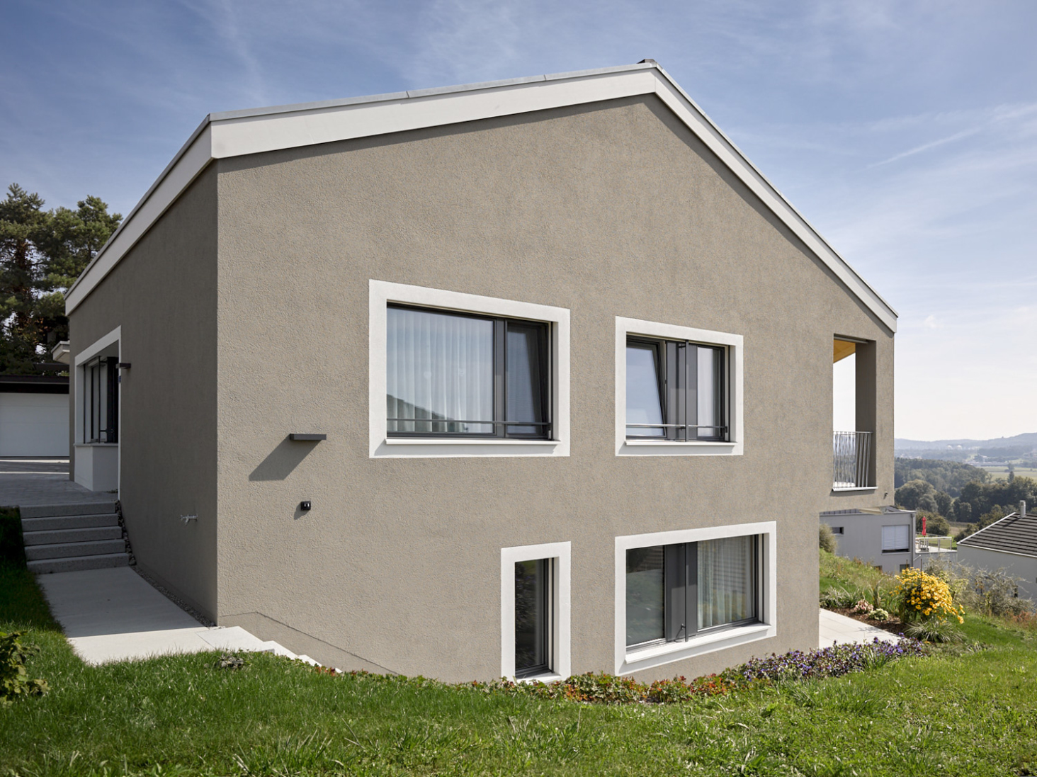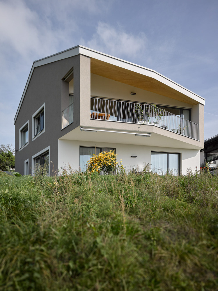 Schöne Aussichten! Auf einer schmalen, langen Parzelle entstand ein Einfamilienhaus nicht mehr ganz im Grünen aber mit Panorama und etwas Überhöhe. Die Form des Körpers leitet sich direkt aus derjenigen des Grundstückes und der Topografie ab. Der einfache Körper erhält seine Tiefenwirkung durch den Einsatz von 2 verschiedenen Farben und Putzstrukturen.
