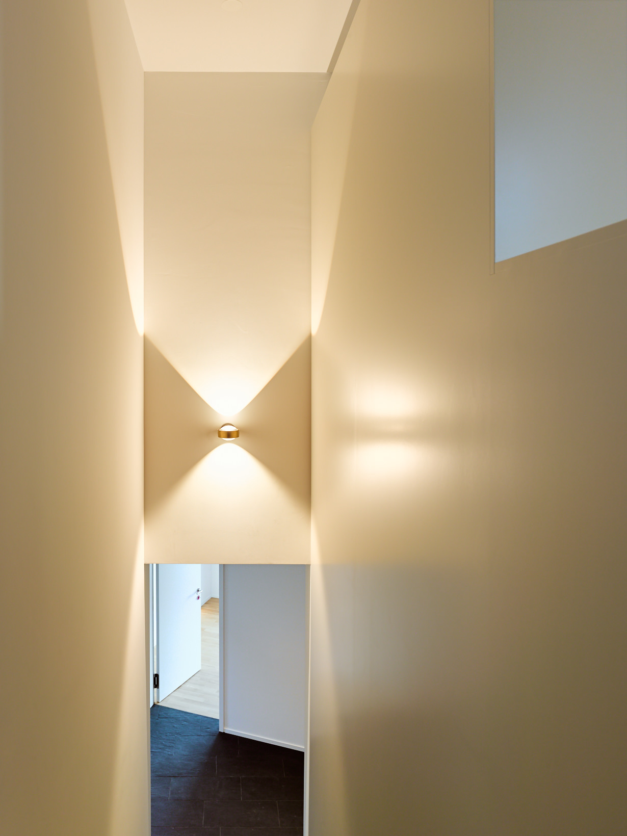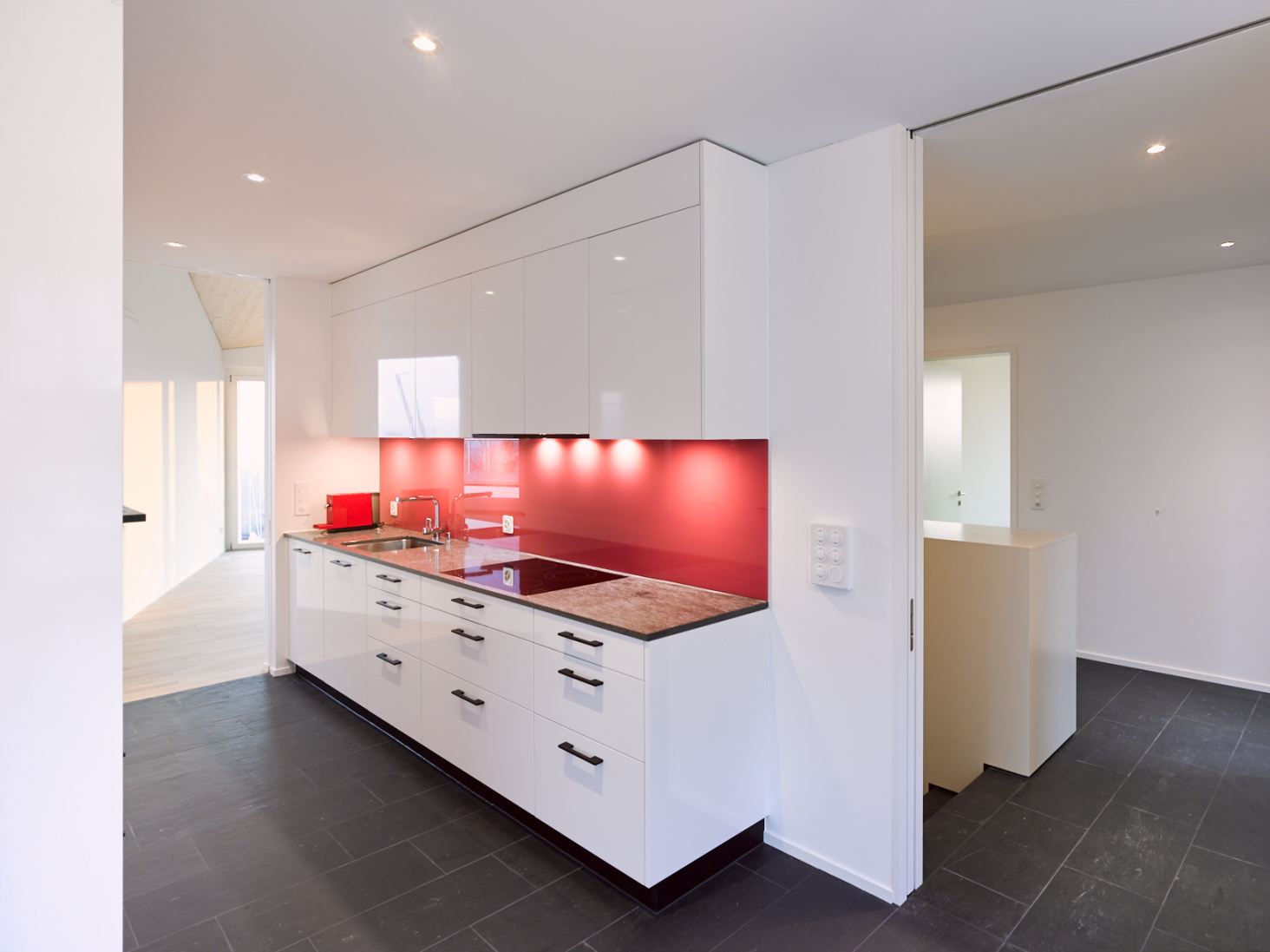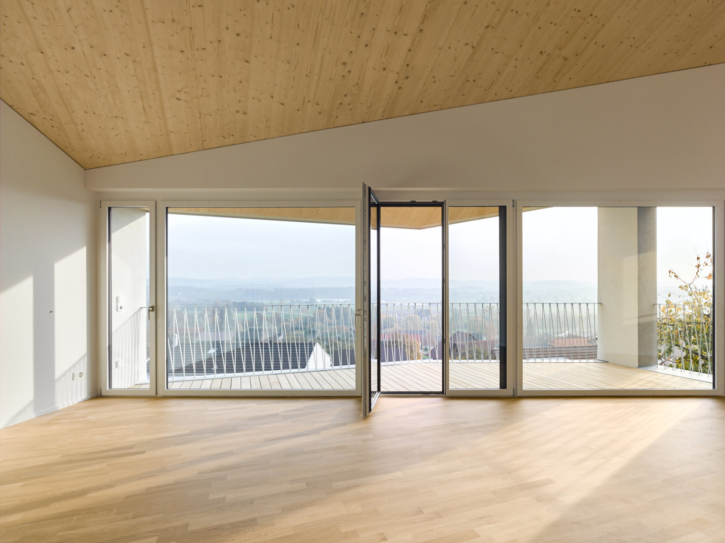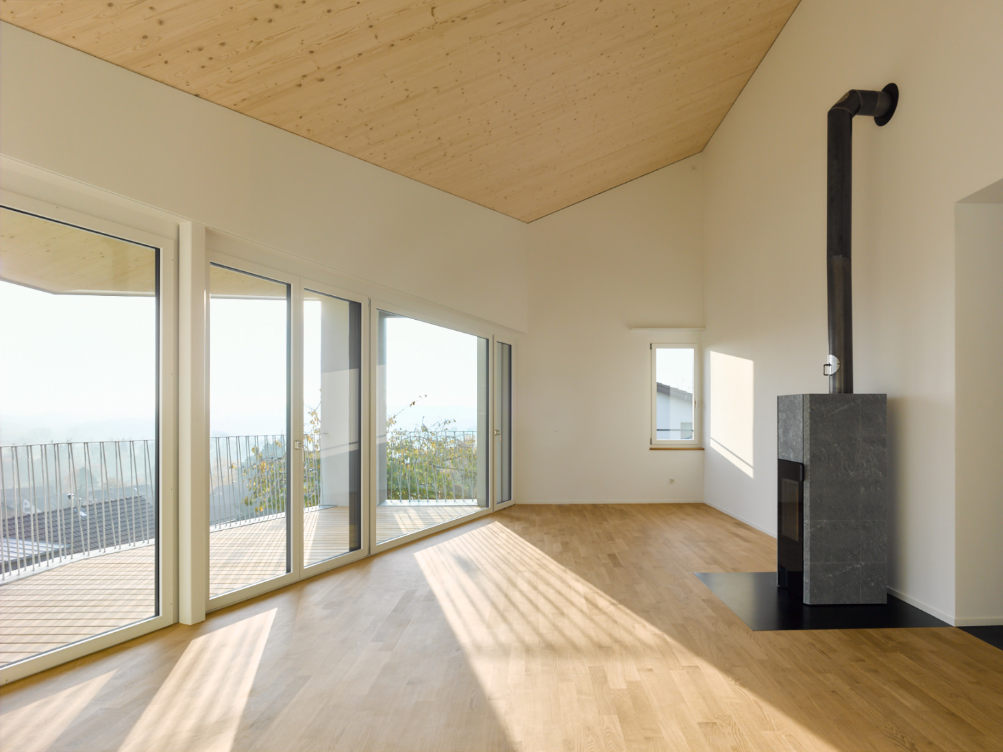 Schöne Aussichten! Auf einer schmalen, langen Parzelle entstand ein Einfamilienhaus nicht mehr ganz im Grünen aber mit Panorama und etwas Überhöhe. Die Form des Körpers leitet sich direkt aus derjenigen des Grundstückes und der Topografie ab. Der einfache Körper erhält seine Tiefenwirkung durch den Einsatz von 2 verschiedenen Farben und Putzstrukturen.